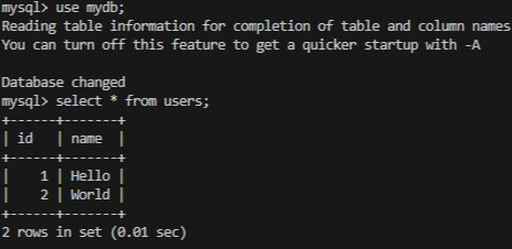 INSERT INTO users VALUES (1, 'Hello'), (2, 'World');