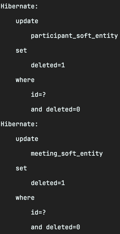 @SQLDelete(sql = "UPDATE meeting_deleted_at_entity SET deleted_at = NOW() WHERE id = ?")