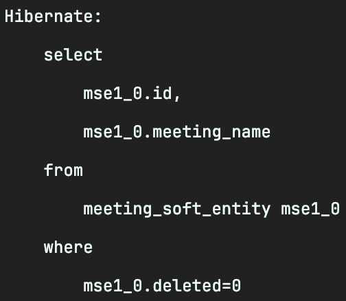 @SoftDelete를 붙인 엔티티를 삭제할 때는 DELETE 구문이 아닌 UPDATE 구문으로 deleted를 업데이트하는 걸 확인할 수 있습니다.