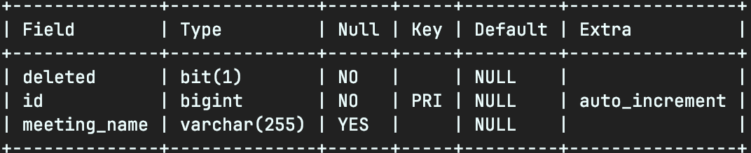 이렇게하고 생성된 테이블을 보면 클래스에 deleted라는 필드를 추가하지 않았음에도 추가된걸 확인할 수 있습니다.